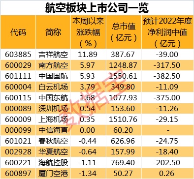 受民航运输产业逐渐复苏影响,本周航空板块个股普遍逆市上涨,吉祥航空(603885)累计涨幅达到11.89%,南方航空、中国国航、白云机场(600004)分别上涨5.97%、5.93%、3.79%。