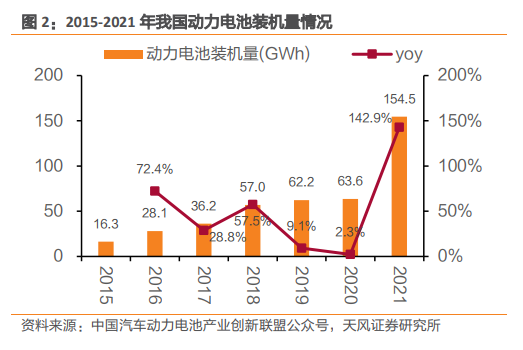 图1:2015-2021 年我国动力电池装机量情况,来源:中国汽车动力电池产业创新联盟公众号,天风证券