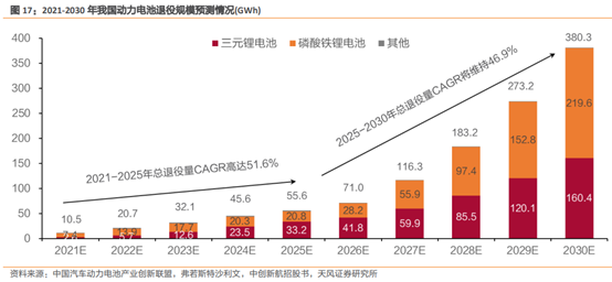 图2:2021-2030 年我国动力电池退役规模预测情况(GWh),来源:中国汽车动力电池产业创新联盟,弗若斯特沙利文,中创新航招股书,天风证券研究所