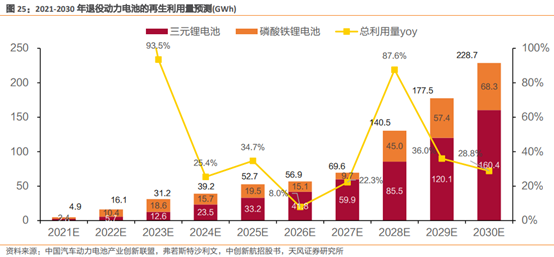 天风证券预计,2030 年退役动力电池的再生利用量将达到228.7GWh,其中磷酸铁锂电池 68.3GWh,三元锂电池 160.4GWh。