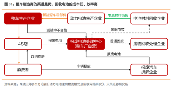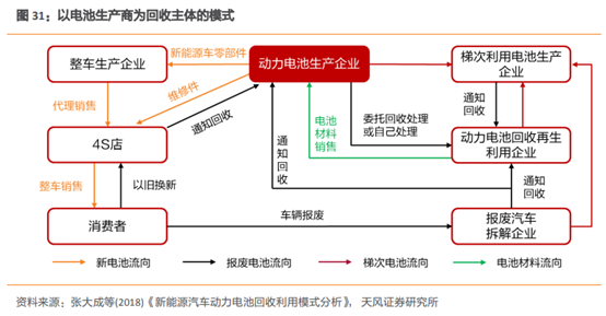 图4:以电池生产商为回收主体的模式,来源:张大成等(2018)《新能源汽车动力电池回收利用模式分析》, 天风证券研究所
