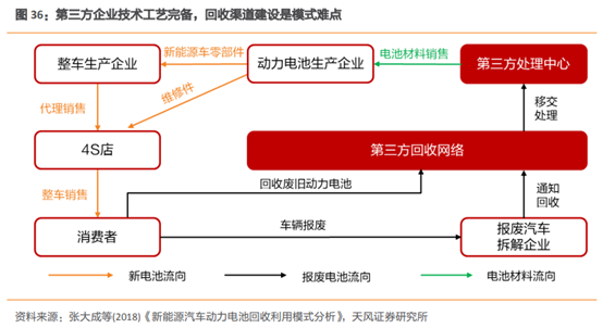 图6:第三方企业技术工艺完备,回收渠道建设是模式难点,来源:张大成等(2018)《新能源汽车动力电池回收利用模式分析》,天风证券研究所