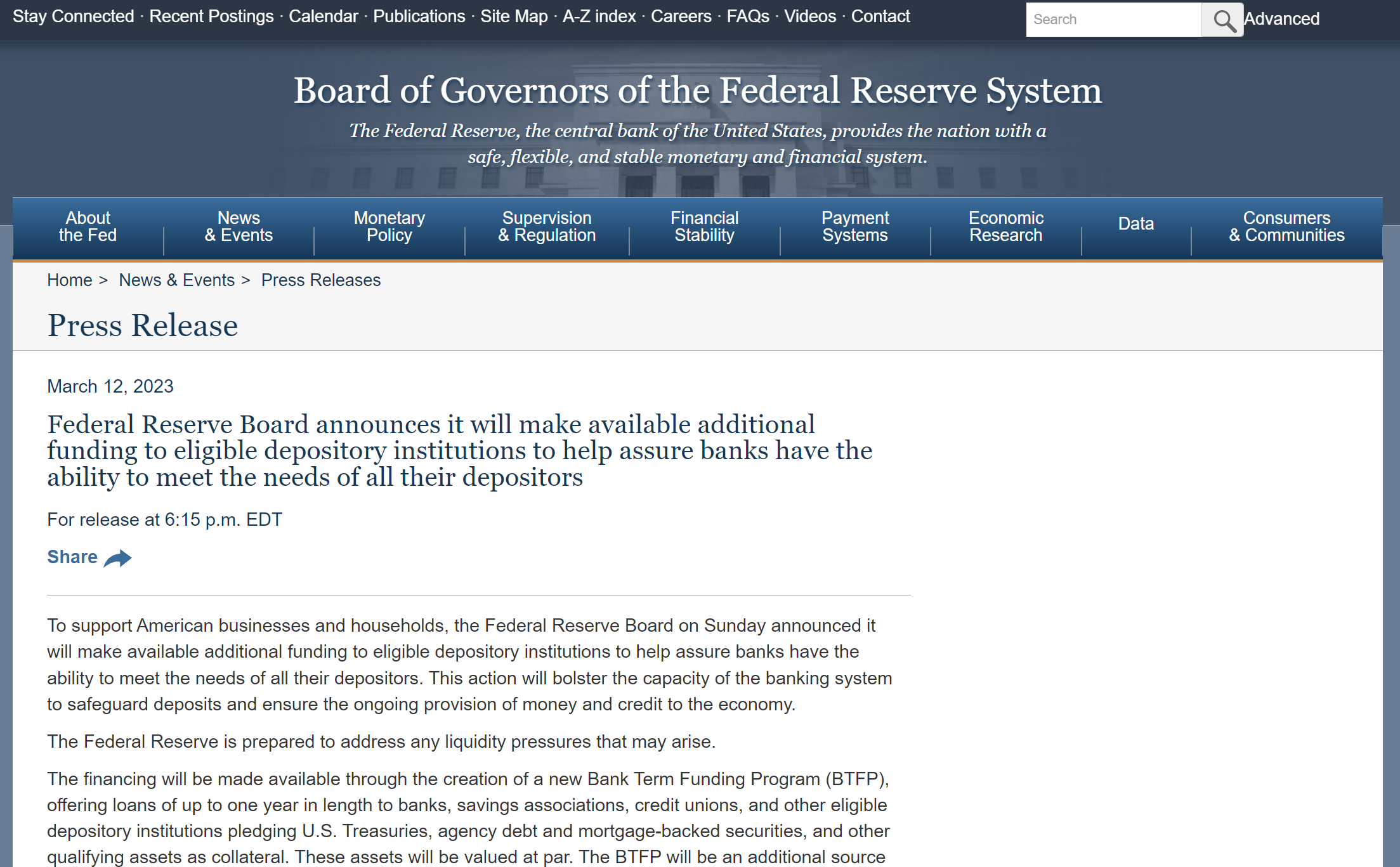 美联储表示,将通过建立新的银行定期融资计划(BTFP)提供融资,向银行、储蓄协会、信用合作社和其他合格的存款机构提供最长为一年的贷款,以美国国债、机构债务和抵押贷款支持证券以及其他合格资产作为抵押品。这些资产将按票面价值进行估价。BTFP将成为高质量证券的额外流动性来源,消除了机构在面临压力时快速出售这些证券的需要。